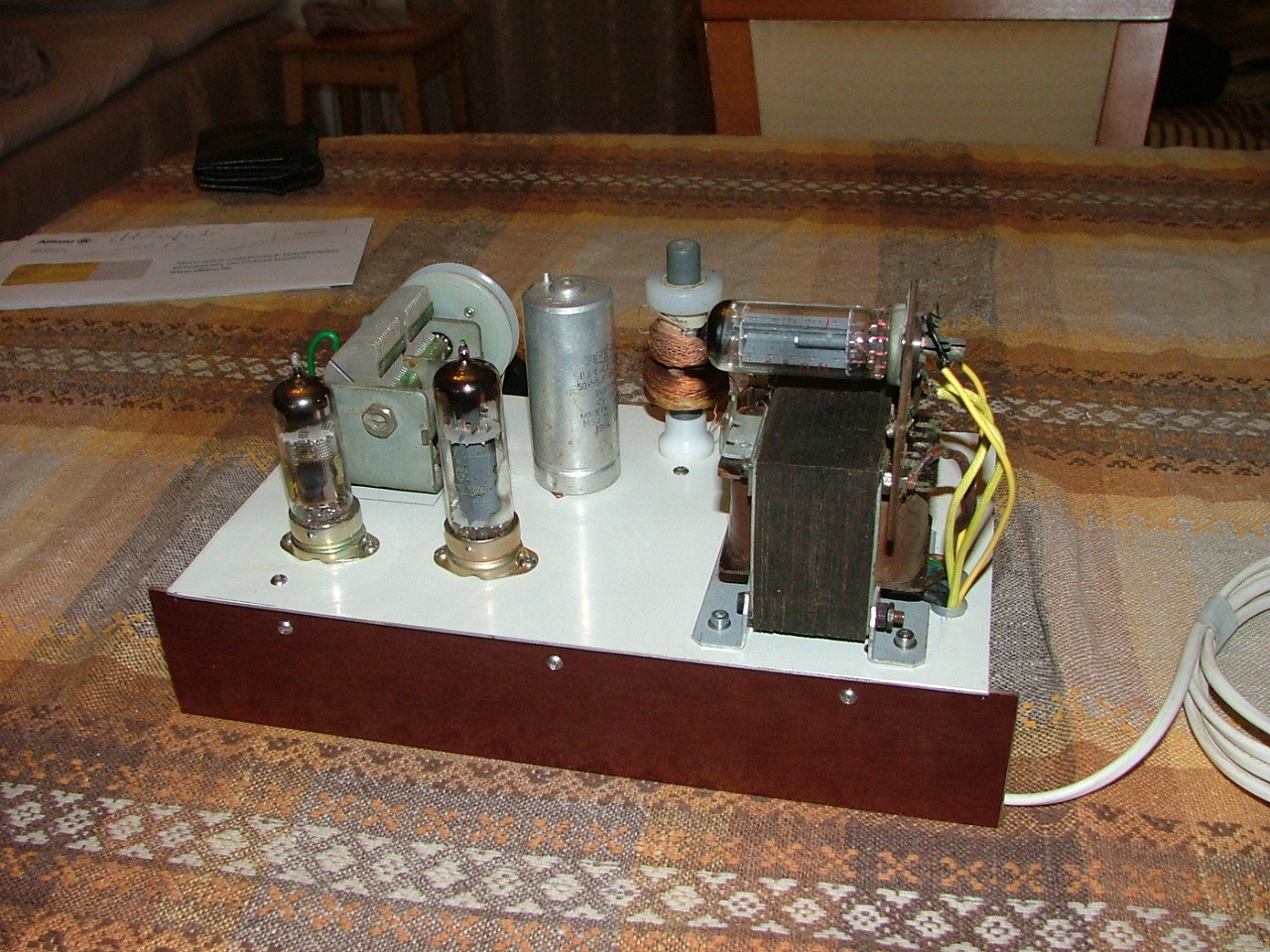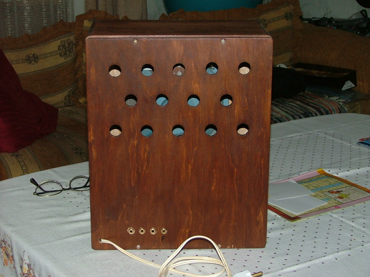 Őszintén megmondom,hogy halvány fogalmam sincs milyen eredetű a hangszóró selyem, mert a rádió dobozát, selyemmel együtt készen kaptam jótevőmtől:Nagy Emiltől.A doboz rajzát és méreteit kértem és Ő egy kész dobozt küldött, amiért nem tudok elég hálás lenni Neki, pláne, hogy az árát se engedte kifizetni.Szerencsére vannak még készséges segítők,én többet is találtam. Ennek a csökkentő tényezőnek (hogy a dobozt,a legnehezebben elkészíthető részt nem én készítettem) a figyelembe vételével is köszönök minden elismerést, a magam és segítő társaim nevében. Minden jót kíván:Tibi.