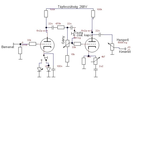 Olvastam egy szerintem nagyon jó könyvet (Designing tube preamps for guitar and bass), ami lépésről lépésre végigvitt azon, hogy hogyan is épül fel egy csöves előfok, és az útmutatásokat követve az alábbi kapcsolást szerkesztettem az orosz csövem (6n2p-ev) köré.