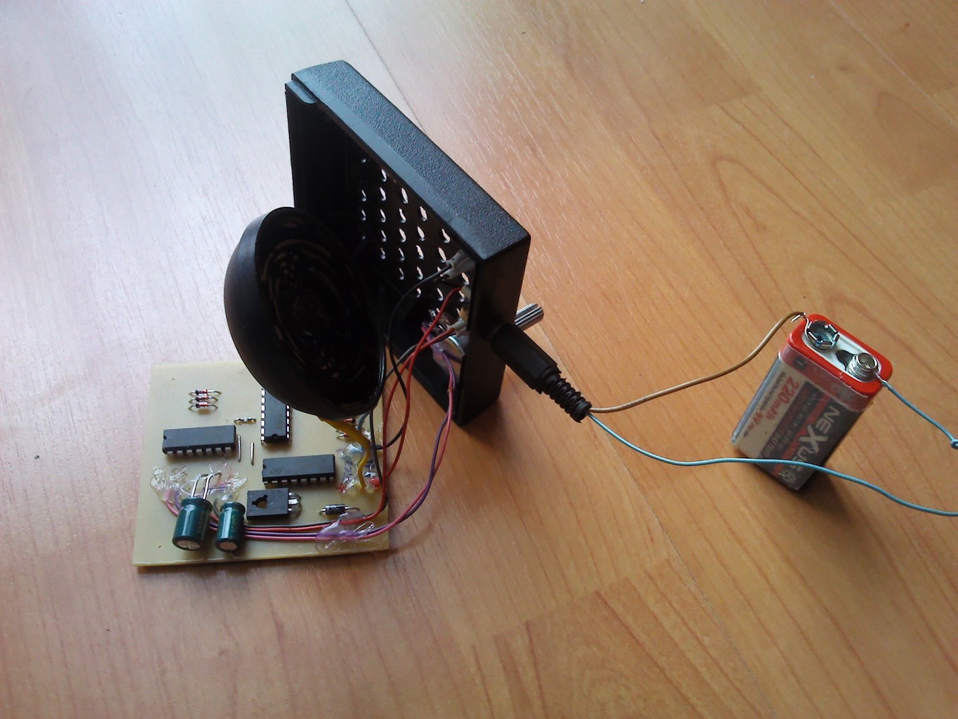 Hali! Na idáig jutottam. Még csak most raktam össze teljesen,így még nem teszteltem.Próbáltam egy 12V os adapterről de ott csak búg.Aztán amint képen is látszik egy 9V-os aksiról. Van egy pattogás amit követ egy emelkedő-csökkenő csipogás aztán megint egy pattogás(mint amikor az elemet rákötöd a hangszóróra). Majd este átnézem és lemérem az ellenállásokat mert minden ellenállást beforrasztatás után lemértem és volt amelyiknek nem volt valós adata. A másik ketyerémen nem lehet hallani ezt a pattogást.Na majd még este kiderül hogy mi a bibi.Egyébként most itt sincsenek még szúnyogok,este 10°C volt.