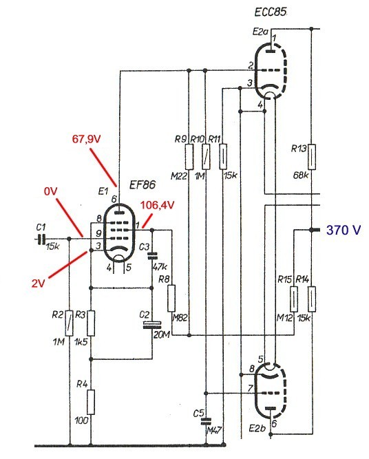 Az EF86 9-es lábán nagyon nem jó az a 344V. Nem zárlatos a 9-es láb az 1-es, 6-os és 8-as lábakkal? Vagy valami partizán kötés lehet ott.