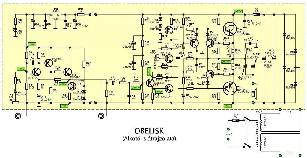 Én is megépítettem, a CHZ tervei alapján a HTA-t, és ma megvolt az indítás és a bal csatornára kötöttünk két labortápot sorosan, mindegyiket belőttük 25-25V-ra. A bal oldalon nem állt be a kimeneti feszültség 1,8-ra le van ülve, azt viszont észrevettük, hogy a 27k-s ellenállás nem volt rákötve a pozitívra, ezt mogoldottam átkötéssel. A jobb oldalon előszőr elszállt egy 100k-s ellenállás, aztán rájöttünk, hogy a BD-k tükrözve vannak, azt megfordítva itt már jobb volt a helyzet viszont nyugalmi áramot nem tudtunk beállítani a jel pedig negatív félhullámban jön vissza és az is torz. Esetleg van valami ötletetek? Ja, a cső még nem volt benn.