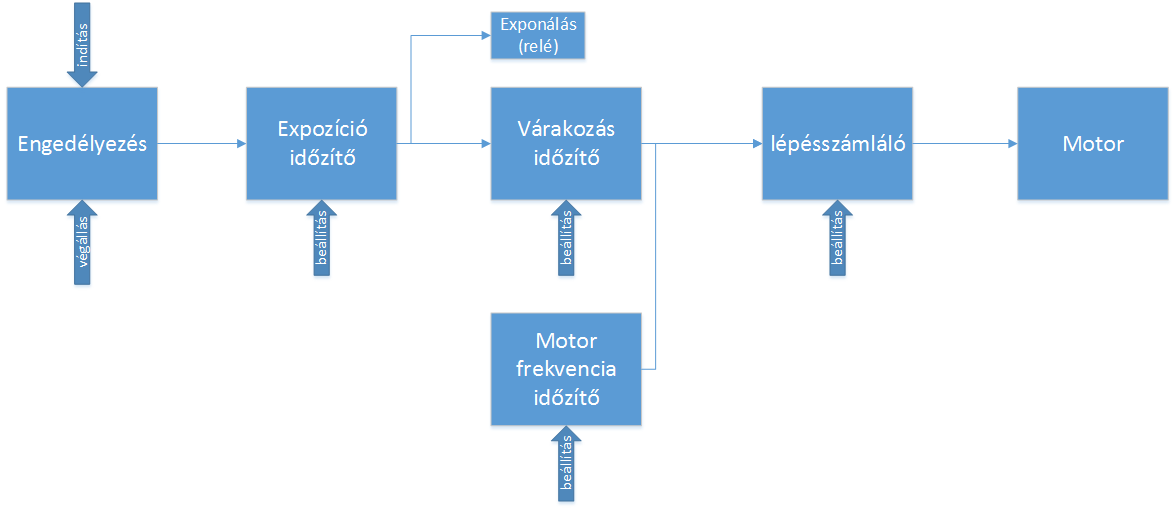 Exponálás. - 1 kimenet Várakozas - t1 idö Mozgás - s1. - egy bizonyos lépésszám Sebesség - v1. Az orajel frekije Ez kb a feladat. A t1 idö lehet 555 S1 - egy számlálo V1 - az lépések frekije - 555 Ezzel az egyszerü algoritmussal szinte minden megoldható. Az expizicioval inditasz, ami egyben inditja a várakozási idöt mérö elsö 555-t. Ha ez visszabillen elindul az s1 számláló ami az orajel impulzusadoját számlálja. Azaz az orajelböl csak s1 számu impulzus jut a motorba ( a sebességet az orajel frekijével lehet változtatni. Az utolso impulzus inditja az expozicios fokozatot, és igy zárul a kör. Elegánsan meg lehetne oldani egy uP-vel is. A köteles mozgatás jo, de ugy hogy a kötelet legalább 2x átveted a hajtott dobon - a végére meg ellensulyt akasztasz, hogy kiegyenlitse a kamera tömegét.