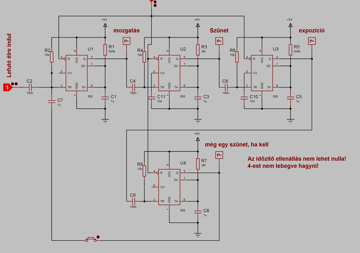 555-tel kapcsolatban lenne pár kérdésem. A triggerel lehet indítani a ciklusokat? Lehet csak egyetlenegy ütemet csinálni vele? Tehát ha mondjuk jön egy indító jel, akkor egy idő múlva produkál egy le/felfutó élt, aztán többet nem, csak ha újabb indítás következik? A válaszok alapján átgondoltam, hogy hogy lenne a legegyszerűbb. A következőre jutottam: Az expozíciók pontos időzítése fontos. Tehát kell egy időzítő, ami folyamatosan ciklik. A ciklus idő adja az expozíciók időbeli távolságát. Ezt kell tudni állítani. A ciklus elején kapja a relé a jelet az exponáláshoz. Ekkor indul az expo utáni várakozási idő (ami a hosszabb záridőkhöz kell). Ezt nem kell túl nagy tartományban állítani. Ha ez eltelt, akkor indítja a számlálót, ami egy másik időzítőtől kapja a jelet (ennek állítható frekvencia kell, bár ez annyira nem fontos). Bizonyos lépést meg tesz. És itt befejeződik az egész, ha lelépte, akkor nem csinál semmit egészen a következő expozícióig, így nem kell ide is egy várakozási időt beiktatni. Előfordulhat az, hogy hogy még nem fejezte be az egy ciklust, amikor már az újat kellene kezdeni, de ezt odafigyeléssel ki lehet védeni. Hogyan lehet a számlálót állítani legegyszerűbben, hogy meddig számoljon? Az egyszerűt a későbbi használat közbeni állítást értem. Összesen kell egy expo távolság idő, várakozási idő, mozgási lépésszám (, illetve a frekvencia). Egy egyszerűbb változat is eszembe jutott. Az egész annyiban módosulna, hogy először mozog, aztán vár egy fix időt, exponál. Mindezt szintén az expozíciók távolságának megfelelő frekvenciával. Ezzel a várakozási idő állítását lehetne elhagyni, viszont tudni kell azt, hogy a mozgás után mennyivel lesz stabilnak tekinthető az egész rendszer, hogy ne mozduljon be. Szerintem ezt be lehet lőni akkorára, hogy nagyon ne korlátozzon a beállításokban, viszont egyszerűbb legyen.