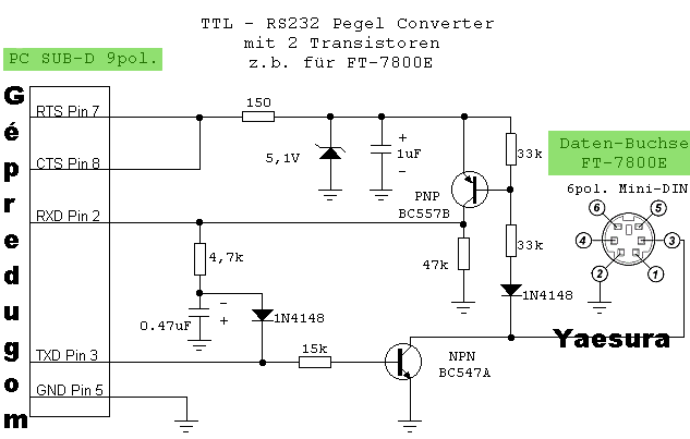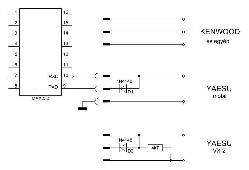 Egy univerzális programozót építek Yaesu és Kenwood rádiókhoz. A Kenwood egyszerű mert külön RXD külön TXD-je van, de a Yaesu közösített. A mellékelt rajz szerintetek jó lessz? Vagy ti változtatnátok az ellenállások értékén? (láttam rajzot ahol a diódát is rövidzárral helyettesítették, de akkor szerintem a rádió küzd a max232 kimenete ellen) A VX2R rádió rajzát nézve van benne diódás túlfesz-védelem és 100k testre húzás, txd esetén egy pnp tranyó huzigatja fel 3V-ra. Az FT8900R esetén viszont semmi sincs, egy 220ohmon keresztül közvetlen a százlábúra megy a jel. A MAX232-ben 400k van beépítve felhúzónak 5V-ra.