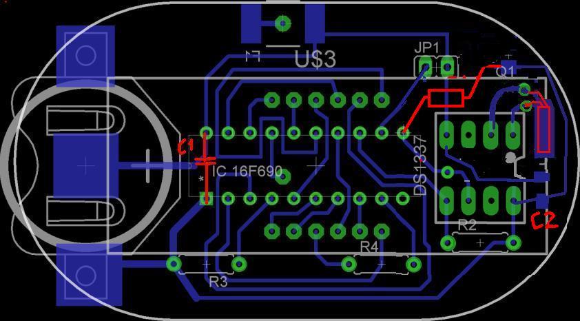 Szia, a C1 , C2 kondi még mindig nincs a helyén az egyiknek az rtc-nél masiknak a pic táp lábai között kell lennie közvetlenül a két láb között. Az rtc hasa alatt nem ajánlott vezetéket vinni , a kvarc külső házát egy ground plate-ra kell felforrasztani vagy leszorítani. Próbáltam belejavítani, de csak png van így nehezebb. A progit átírom... Ja és most látom, az R2-t is a + tápra kell kötni !