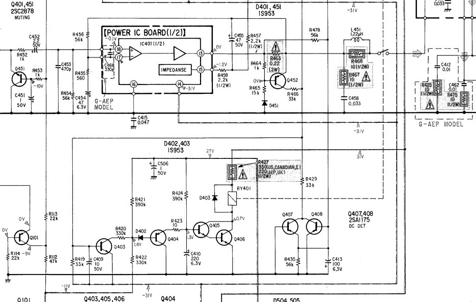 Szia! A kimenő jel útjába el lehet helyezni egy ellenállást és figyelni a rajra eső feszültséget. Ebből már lehet olyan következtetést levonni, hogy a megengedettnél alacsonyabb impedancia terheli az erősítőt, és bontatni a koppanásgátló reléjét. Mellékelek egy rajzot, melyen R463 0,22 ohm 2W ellenállás végzi a kimenő áram figyelését. A rajta eső feszültség amplitúdó arányosan korrigálva kerül Q452 bázisára. Parányi hiba, hogy csak a negatív periódust figyeli, de a hangszóró leválasztás relatív lassúsága miatt ennek alig van jelentősége.
