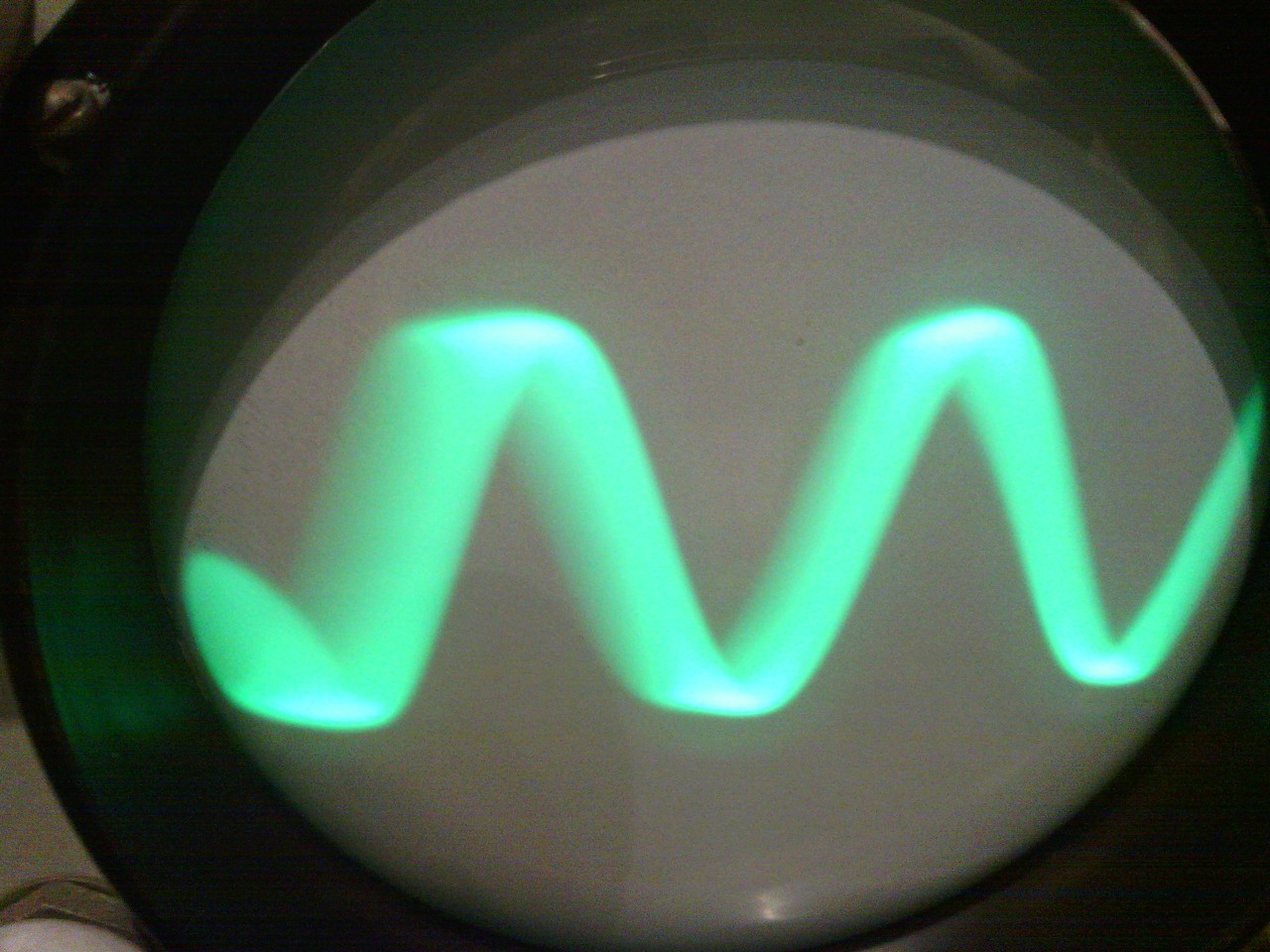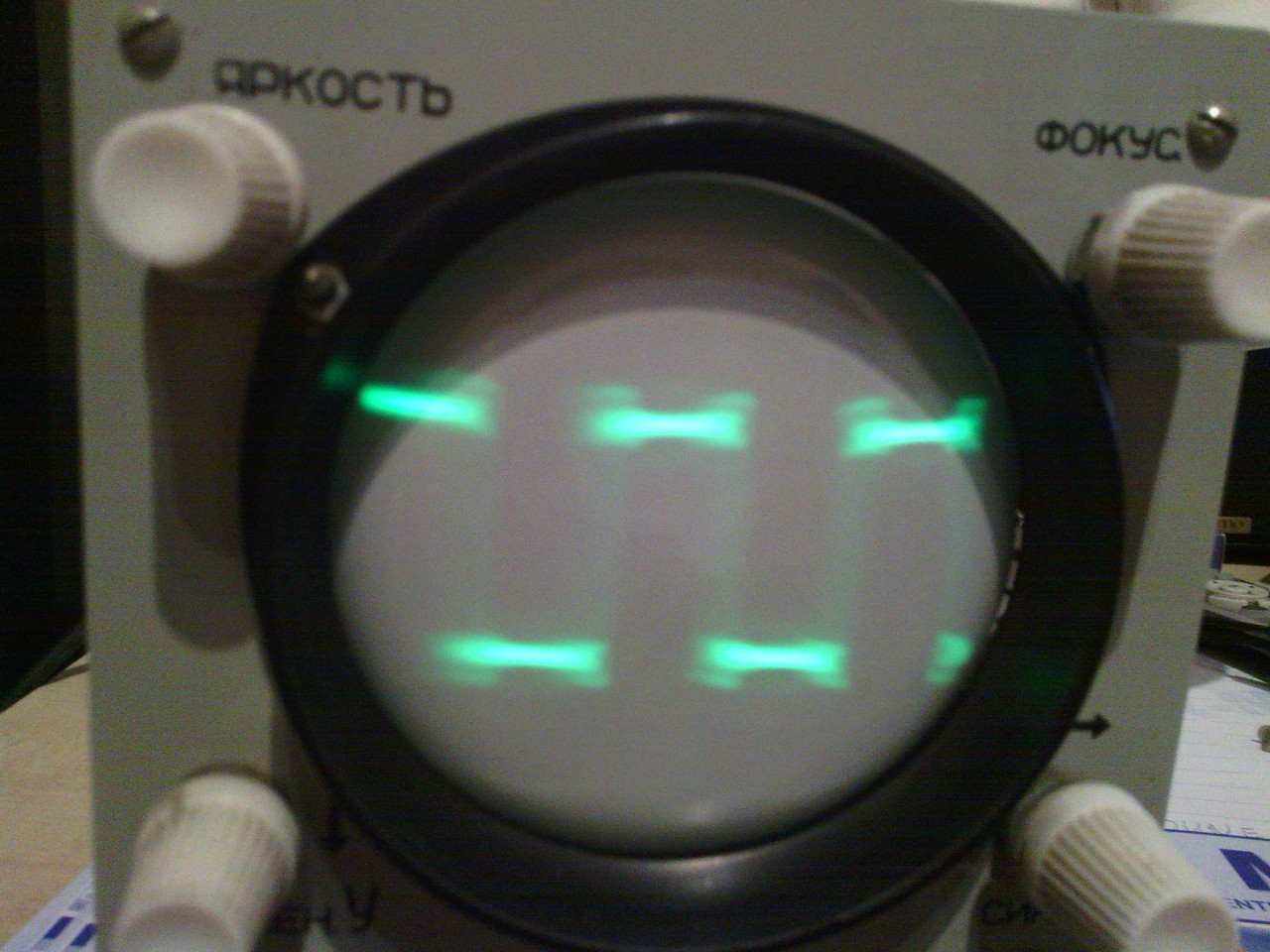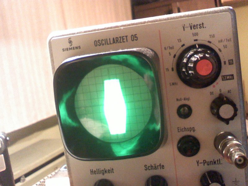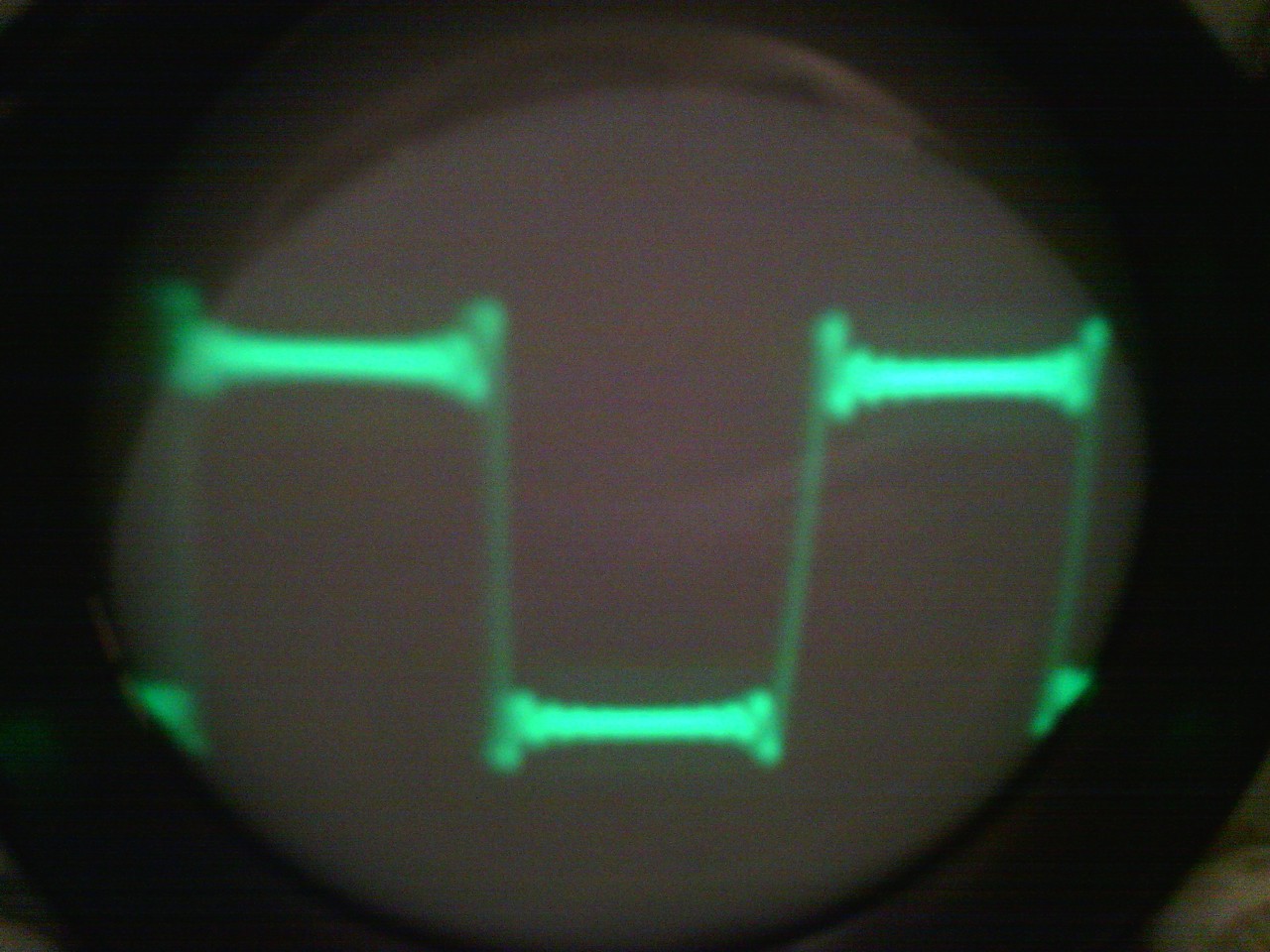 Kezd összeállni a szkóp. Jel nélkül a vonal teljesen szép vékony, jól fókuszálható. De ha adok rá jelet ( mindegy, hogy szinuszt, vagy négyszöget ), akkor azon már fókusz kell állítani. Viszont nem teljesen tökéletes a kép. Ez mennyire normális?