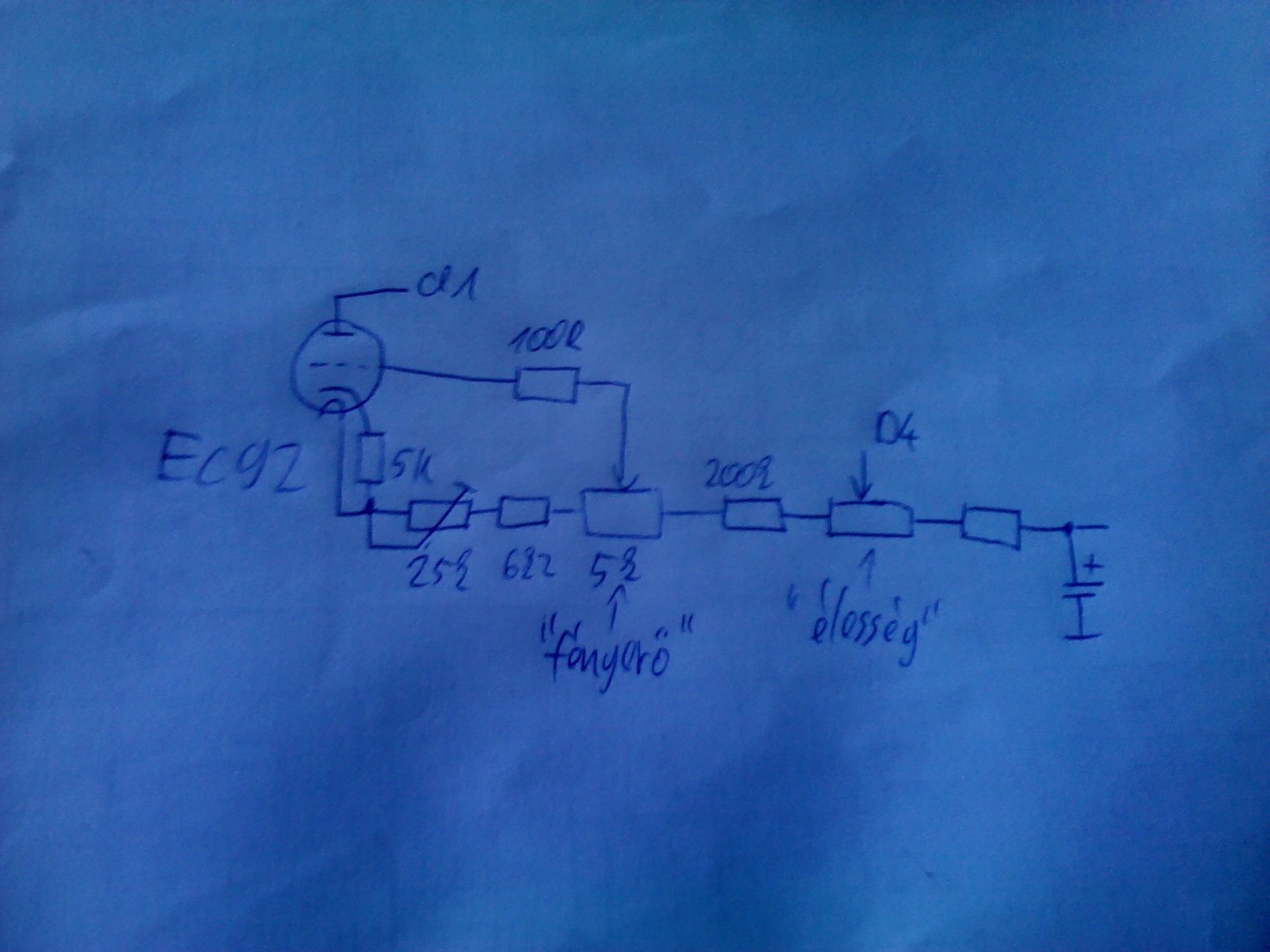 A trimmer tekergetésével csak enyhén változik a megjelenő jel területe. Fűtés van. Az anódfeszültség testhez képest -103V. Próbáltam másik EC92 vel is. Ugyanez a jelenség áll fent. Az EC92 katódjához képest 300V körüli a feszültség az anódján.