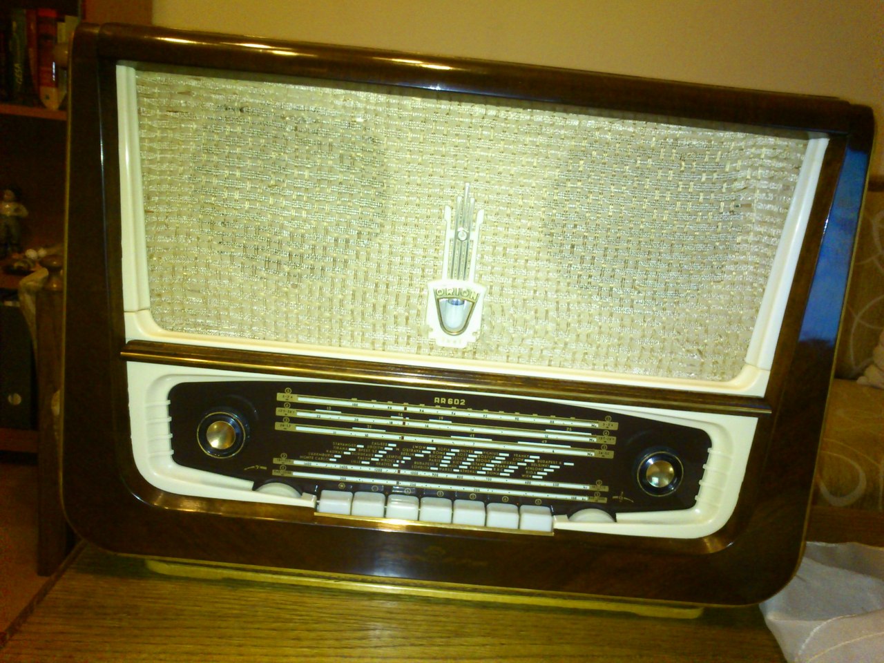 A készülékben minden eredeti, és a több mint 80 éves masina úgy néz ki, mint ha most jött volna ki a gyárból. Nincs benne egyetlen forrasztás sem, minden csavarokkal van rögzítve mindenhez. Erre valóban rá lehet mondani, hogy még úgy van "építve".Természetesen rögtön nekiálltam az átalakításnak, nagyon vigyázva hogy ne látszon semmi. Az elkókba új belsőrész került, a hálózat becsatlakozásához csináltam egy kis dobozt, benne egy Gretz egyenirányítóval. Persze másoltam a már meglevő címkékből, és így arra is került felirat. Ezután ráment vagy egy nap a szükséges feszültségek gondos beállítására, a gépben ugyanis nincs hál. trafó, így minden feszt soros ellenállásokkal kell belőni. Szerencsére a lényeges helyeken állítható ellenállások vannak. Nagyon szépen szól az Orion selyemmembránossal, az este vagy 8-10 külföldi adót is fogtam a hazaiak mellett, elég nagy hangerővel, persze komoly kinti antennával, meg földeléssel. Hullámot úgy lehet váltani vele, hogy ki kell cserélni a tekercseket. Kell még csinálnom hozzá egy leválasztó trafót, mert nincs benne elválasztás minden eleme kapcsolatban van a hálózattal, és ha nem a műhelyasztalból használom nem szeretném hogy megvágjon valakit. A többi a képeken.