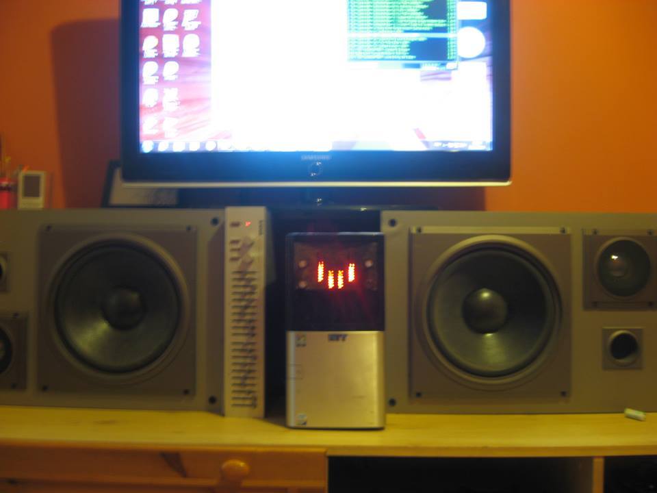 Csináltam egy másik erősítőt is egy számítógépházba. Egy régi PC-tápot alakítottam át, hogy +-25 Voltot adjon le, ehhez építettem a TDA7294-eket, egy lm1036-os előerősítővel. Csak az volt a gondom vele, hogy nem tetettem biztosítékokat a tápegységhez és letesteltem a -25V-os ágat, amitől megbuggyant. A kivezérlésjelzőket félig-meddig bontott alkatrészekből tákoltam össze.