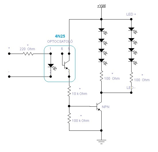 Lényegében a pic kimenetére egy opto csatoló egyik lába van kötve előtét ellenálláson keresztül, a másik megy testre. (150ohm)(mint egy led bekötése) Az opto csatoló másik oldalán pedig a 12Vról van meghajtva a tranzisztor. A tranzisztoron keresztül kapják a ledek a feszültséget, mert a ledsor-- 4db led sorba és pár ohmos ellenállás, és ebből a blokkból van 10db párhuzamosan. Ahogy a kimenet villogtatja az opto csatolót úgy ereszt át a másik oldalon. Ehhez nem csináltam külön kapcsolási rajzot. (próbanyákon összeraktam) (De kézzel mindjárt lerajzolom...) Minden mást a PIC intéz. A pic 12V-ról 7805ön keresztül 5.08 V-on dolgozik. (7805ön 100nF kondik előtte utána testre hűzva) Ha hardveresen beállítom a pic-et mint először, akkor a pic lábára rátettem egy ledet azt szépen szabályozta. Viszont a fenti megoldásban(picben való állítás nélkül) optocsatolón keresztül meg se mozdult.