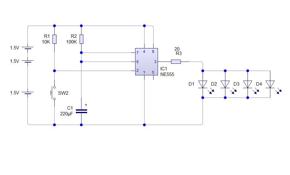 Az általam épített ne555-ös időzítő áramkör 7sec-re állítva nálam úgy működik a rajz alapján megépítve, hogy folyamatosan bekapcsolt állapotban van vagyis ha led-et kötök rá az folyamatosan világít majd ha megnyomom az időzítő gombját 7sec-re kikapcsol majd megint folyamatosan világít.