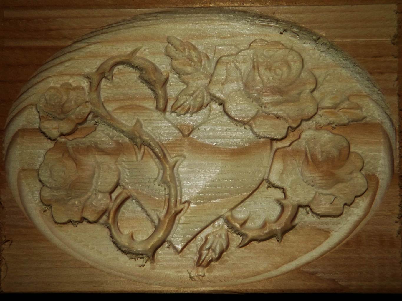 Meg ugye nem keményfa, hanem fenyő ezért itt ott szőrös. 2mm-es kukoricamaróval martam, és 30°-os 0.3-as gravírtűvel simítottam. A póknál 0.15 volt a lépésköz a virágnál 0.1-ed.