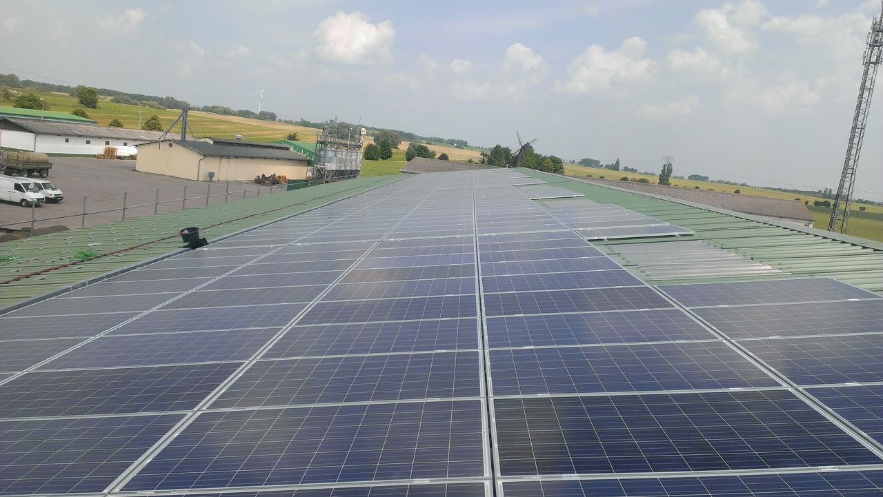 Németország, Magdeburg. Agro Bördegrün mezőgazdasági telepen múlthét csütörtökön adtuk át a rendszert. 215kW 924db 235W-os polikristályos modul. Az egyik kedvenc munkám volt a helyi körülmények miatt (csak ne lett volna 3 napig 35 fok). A REFUsol frekiváltók magyarországon készültek. 10db 20kW-os és 1db 13kW-os került felszerelésre.