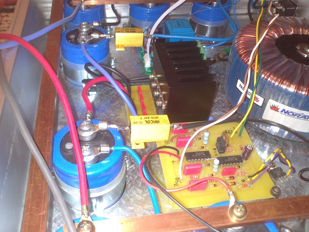 Teljesen igazad van,ha így volna...de a képet jobban megnézed, a baloldali profil alsó részénél kikandikál egy nyílás fele, az egy 32mm-es körkivágóval készült, így a félvezetők hőpasztával közvetlenül a profil alsó részére vannak csavarozva, mivel ott a legaktívabb a hűtés, a felső kilógó csavar mindössze, a profil rögzítése a dobozra.