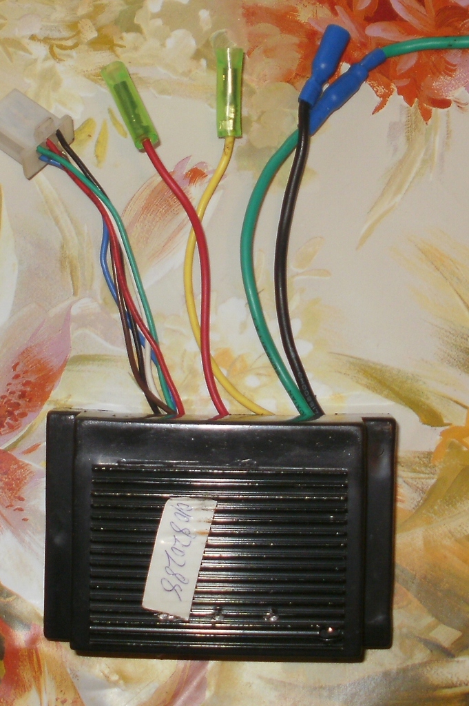 A fekete - zöld a motorra, sárga - akksi testre, piros - gyújtáskapcsolóhoz, csatlakozó dugóban - piros; zöld; fekete - gázkar, - fehér - barna fékkarokhoz, vagyis a motor tiltás, a kék változó, általában plusz szál a világításnak.