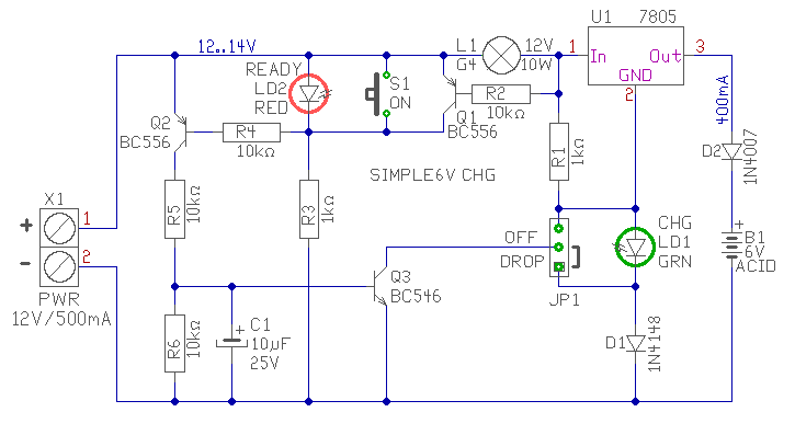 - A 7805 5V-os kimeneti feszültségét megemeljük egy Led és egy dióda feszültségével. A D1 dióda tulajdonképpen kompenzálja D2 feszültségesését. Egy zöld Led nyitófeszültsége 2,2V (vagy ilyen Led-et kell választani) így az 5V-al együtt, 7,2V lesz a töltési végfeszültség.