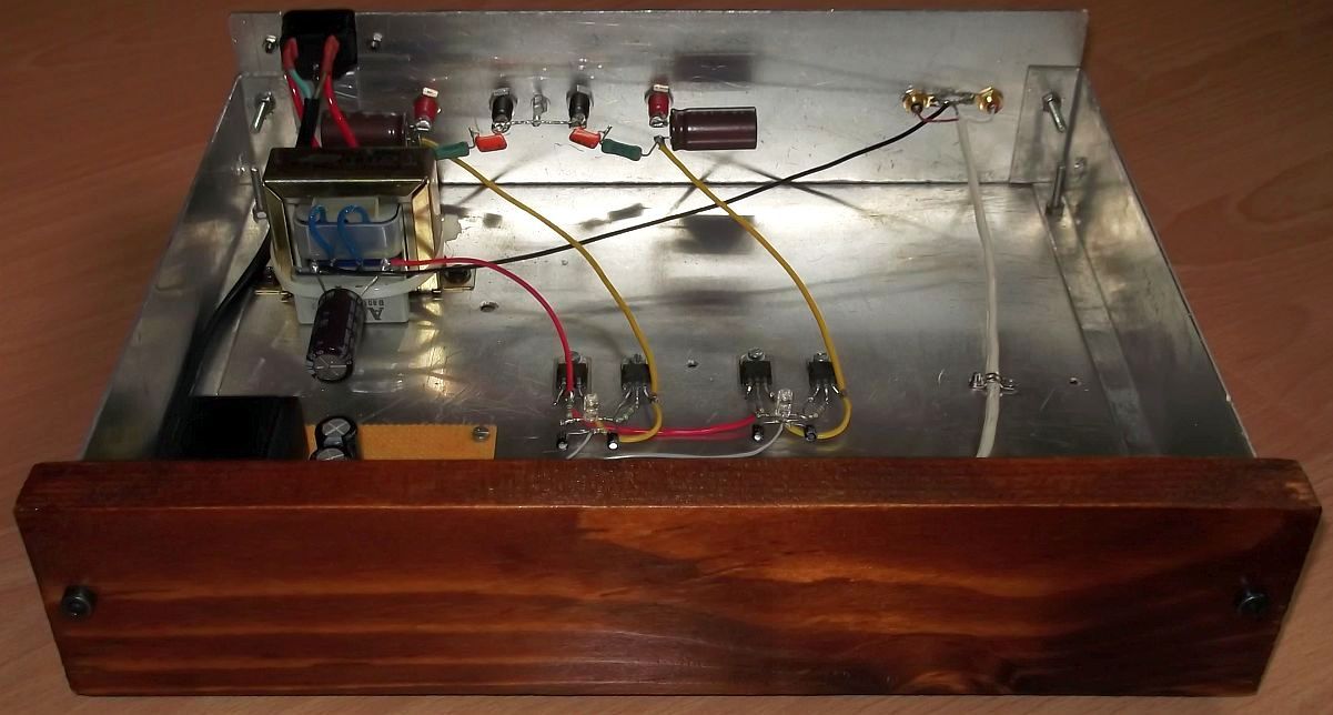 Végre összeszedtem magam és megcsináltam a bufferem darlingtonos változatát. Hangban nem sok különbséget vélek felfedezni, persze a megnőtt dinamikán és jobb mélyeken ill. nagyobb kivezérelhetőségen kívül. Síri csendes, semmi zaj vagy brumm, nekem ez nagyon fontos a folyamatos üzem miatt, nincs is rajta kapcsoló sem. A zobel network AD712 és NE5532 esetén muszály volt mert gerjedett, de pl. TL072, 082 és 4558 esetén nem kellett. A meghajtás tápja kétszerezős, egy kis 9V-os trafóról megy, a végfok egy nagyobb 9V-osról. A földelés feltűnően furcsa, de nagyon jól bevált. A doboz a bemenetnél van hozzáföldelve a táphoz, a pnp tanyók és a kimenet a dobozról helyben kapják a földet.