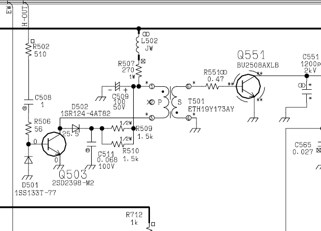 Egyelőre csak egy "gyanús" alkatrészt találtam, a rajz szerint 270 ohm 1W ellenállás, kiszedve 100 ohm mérhető, eléggé megkopott külseje van. Elvileg ezen keresztül kapja a meghajtó trafó a tápot, R507 jelű.