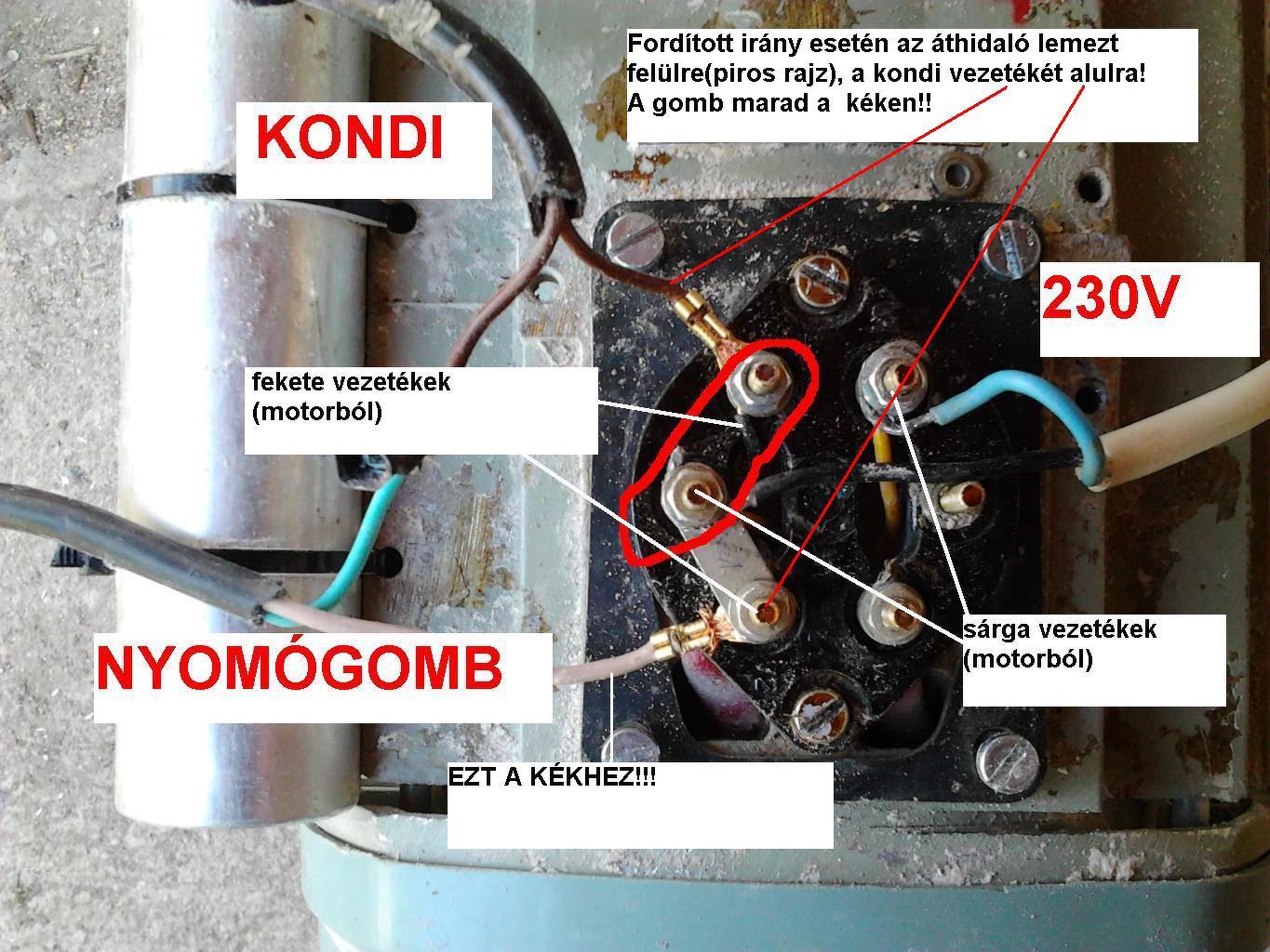 Beírtam a képre. Remélem jól láttam a vezetékeket, ami a motorból jön, meg a bekötött kábelek is passzolnak? Ha átteszed a lemezt, jónak kellene lennie. Így megfordul a segédfázis tekercs bekötése. Ui.mielőtt kötöd, süd ki a kondit, ahogy fongab is írta(nyomógombot nyomd meg!!) A hozzászólás módosítva: Júl 14, 2013