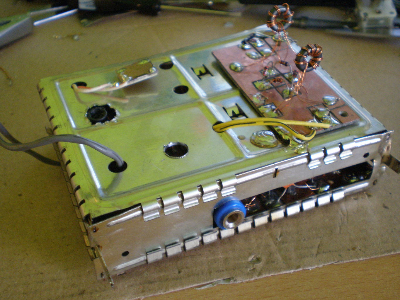 Nos elkészültem a rádiófrekvenciás résszel, egy régi TV-tuner dobozába építettem be.Egy kicsit úgy néz ki mint amit elütött egy autó.Még elkészítem a HF részt aztán holnap kitelepülök és ki is próbálom.