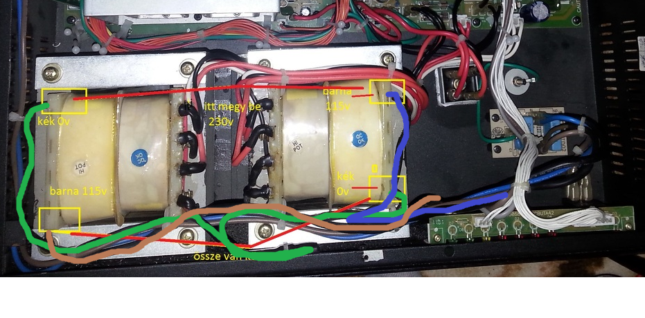A fényképen látszik, hogy így volt bekötve, ott valami más probléma van és az még ttalán mindíg ott van, viszont, ha a primer nem lett módosítva, akkor most csak egy fázis hajtja a kondikat, lehet, hogy a nyűglődés közben tönkre is ment az egyik trafó és menetzárlatos lett valami más szekunderekkel és amiatt volt a baki.