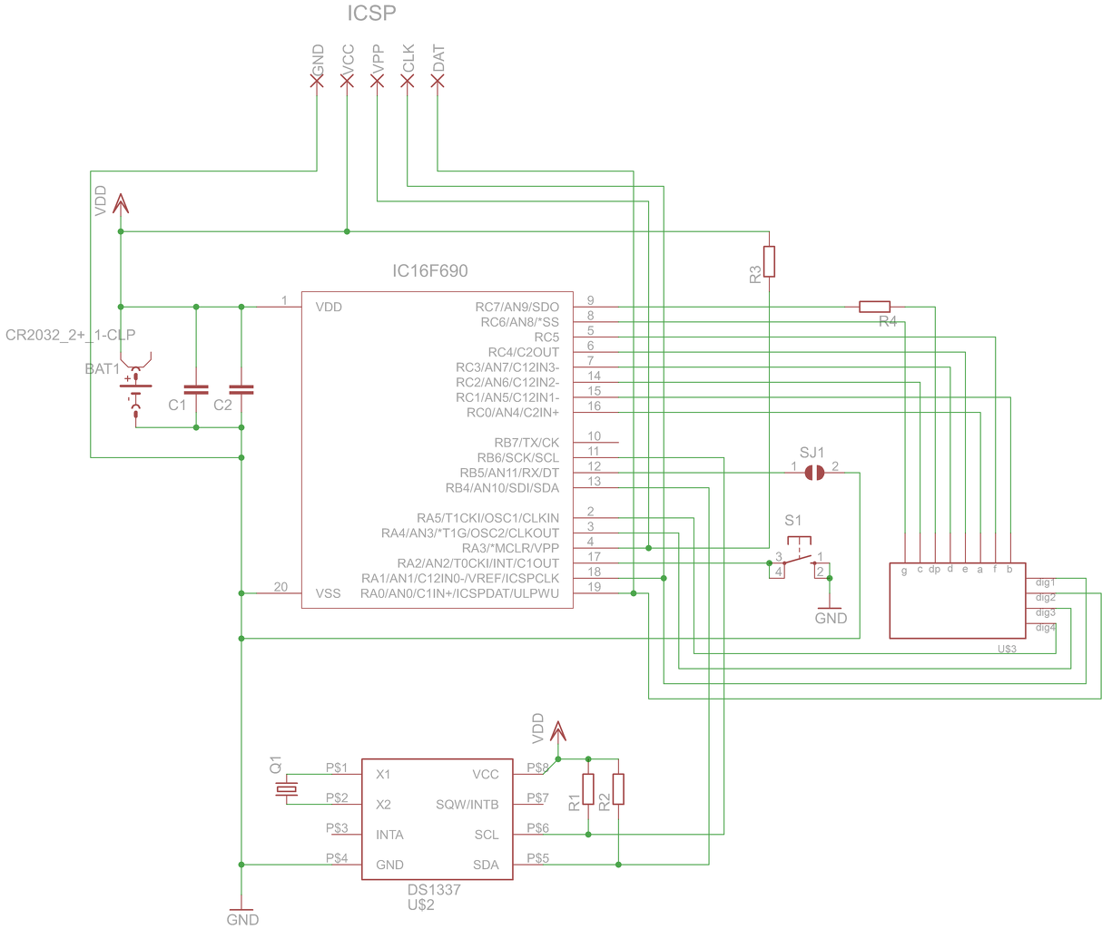 Szia, a C1 , C2 kondi még mindig nincs a helyén az egyiknek az rtc-nél masiknak a pic táp lábai között kell lennie közvetlenül a két láb között. Az rtc hasa alatt nem ajánlott vezetéket vinni , a kvarc külső házát egy ground plate-ra kell felforrasztani vagy leszorítani. Próbáltam belejavítani, de csak png van így nehezebb. A progit átírom... Ja és most látom, az R2-t is a + tápra kell kötni !