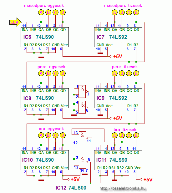 A LED -ek bekötése: Milyen kijelzést szeretnél? BCD számábrázolásút: Az A, B , C, D sárga körökkel jelölt pöttyökre egy-egy (LED és soros ellenállást) köss. Decimális kijelzés 7 szegmenses kijelzőn: Az A, B , C, D sárga körökkel jelölt pöttyökre, helyiértékenként egy BCD - 7 szegmenses átalakító (7447, 74247 stb) A, B, C és D bemenetét kösd. Az átalakító a, b, c, d, e, f, g kimeneteire egy-egy ellenálláson keresztül egy közös anódos hétszegmenses kijelző katódjait (rendre az adatlapokon található rajzok szerint). A közös anódot pedig a tápra. Órajel: a föld és legalább 3V -ot között változó, 1Hz frekvenciájú órajelet. Kellene készíteni egy alap oszcillátort TTL elemekből és 100kHz, 1MHz, 10MHz quartzból. Kapcsolás a Texas TTL receptek könyvben található. Ennek kimenetét kellő számú 10 -es osztóval (7490, 74LS90) leosztva előállítható az 1Hz -es órajel. 100kHz -ről 5db, 1MHz -ről 6db, 10MHz -ről 7 db osztó kell.
