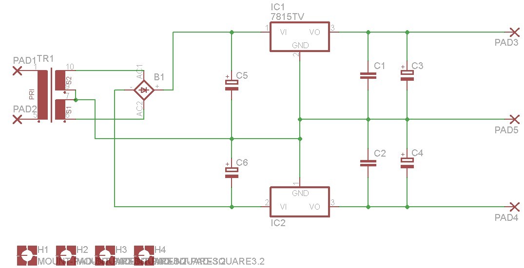 Mellékeltem egy kettős táp kapcsolási rajzát, olyan van ebben is, ahogy elsőre mondtam is, és ahogy sejtettem, a + és - 15V-os stabilizátor..