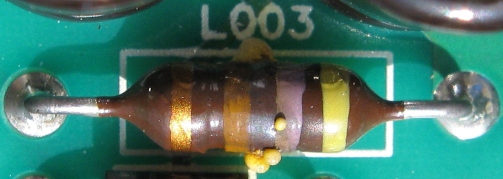 A színkódolás szerint 470uH-s induktivitás, de az ellenállását már nem tusom mérni, mivel tönkrement. Nagyon fontos lenne, ha mindenben egyezne az új értéke, mert egyébként elindít egy láncreakciót és az áramkör többi tagja is kipurcan.