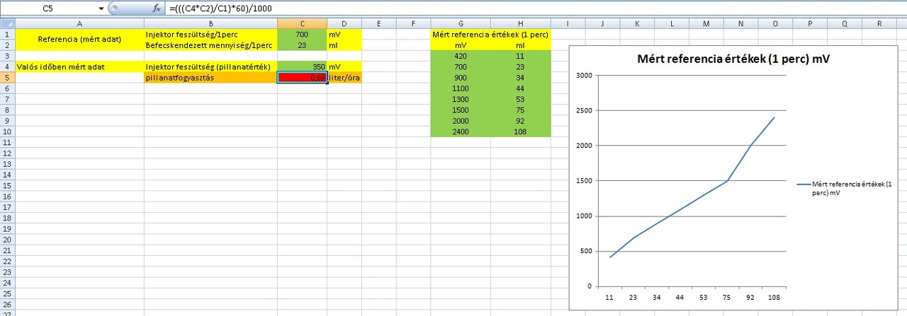 A diagram a mért referencia értékeket mutatja. Látszik hogy közel egyenesen arányos a feszültség a befecskendezett mennyiséggel. 1500:75-nél valószínűleg egy mérési hiba csúszhatott be...
