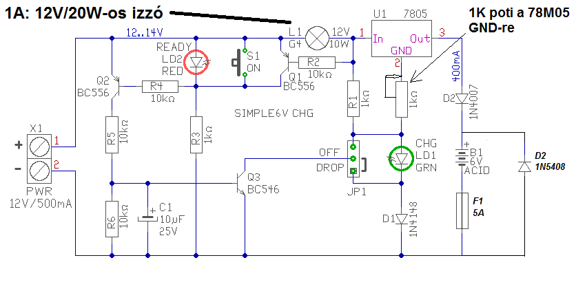 - A 7805 5V-os kimeneti feszültségét megemeljük egy Led és egy dióda feszültségével. A D1 dióda tulajdonképpen kompenzálja D2 feszültségesését. Egy zöld Led nyitófeszültsége 2,2V (vagy ilyen Led-et kell választani) így az 5V-al együtt, 7,2V lesz a töltési végfeszültség. Szerintem a LED-del sorba kell kötni. (mert a LED körben határozza meg a töltési feszültséget, ha nem úgy lenne akkor most is 7805+LED+1N4148 lenne, de nem szól bele az eredetiben sem az 1N4148, ezért is kell a LED-del közvetlen kötni. (sztem) A hozzászólás módosítva: Júl 26, 2013