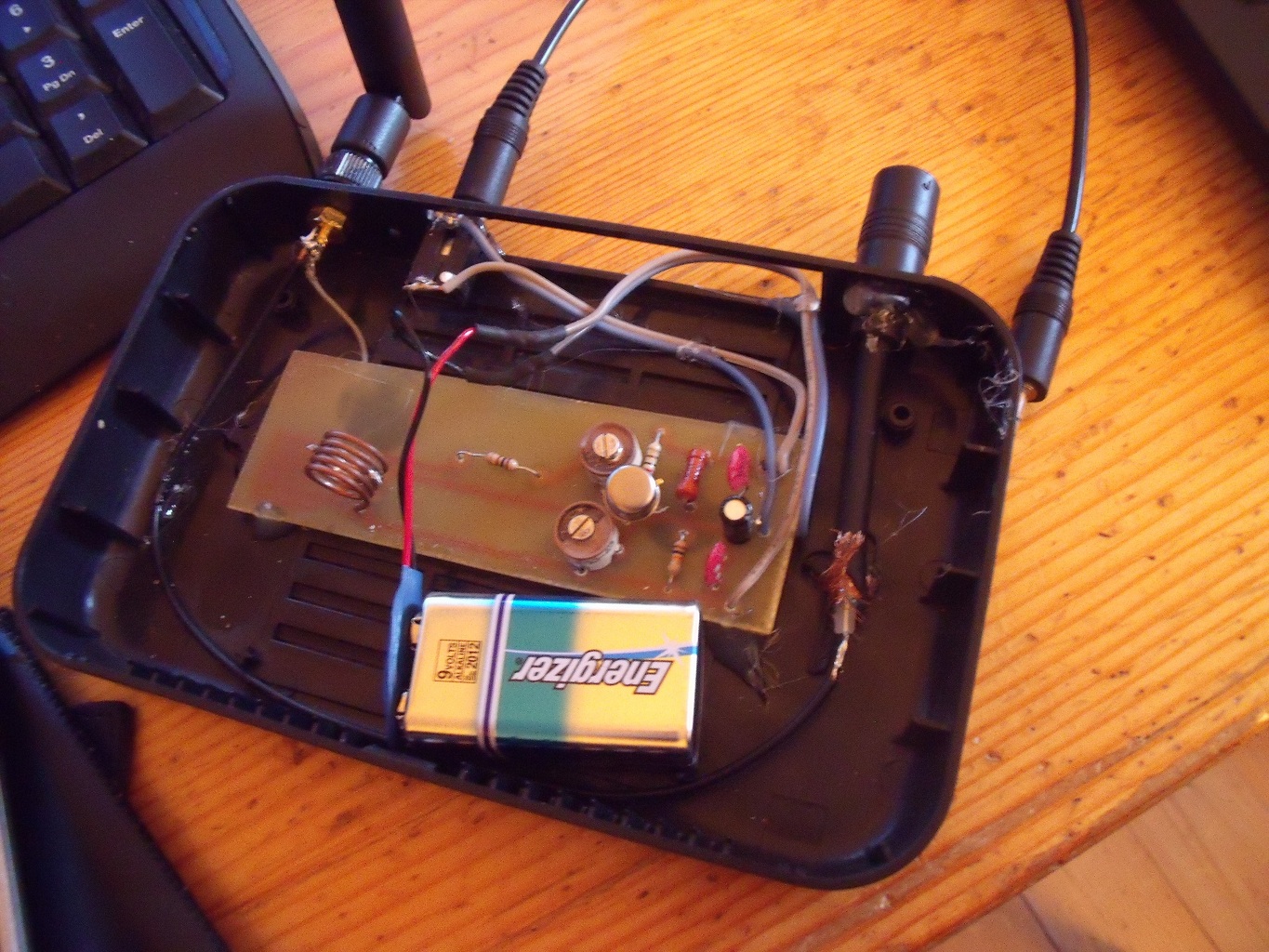 A tekercs 4 menetes, 0,8 vagy 1mm ármérőjű rézhuzal 10mm belső átmérővel. A tekercset kissé szét kell húzni úgy, hogy a menetek között kb. 1-1,5mm távolság legyen, tehát csupasz rézhuzal is jó. Leágazás a második meneten úgy, hogy a tekercs „3 lábú” legyen. A képen egy wifi-nek a dobozába van beépítve. A méretéhez képest egész jó a hatótávolsága. A hangolással szórakozni kell egy kicsit, érdemes műanyag csavarhúzóval végezni. Az antenna előtt lévő 20nf-os kondenzátor elhagyható. A hozzászólás módosítva: Júl 27, 2013