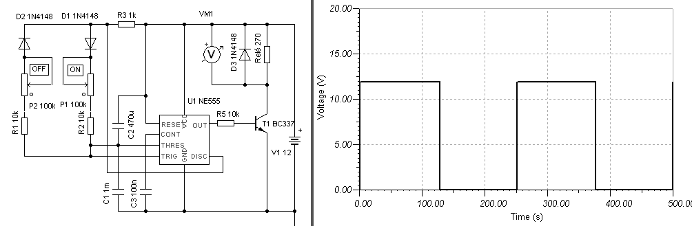 Egy olyan kapcsoló áramkör, amit lehet időzíteni 2 potival a bekapcsolások és a kikapcsolások idejét . Ez az idő 10 sec és 120 sec között lehessen állítani. Amim van, amiből lehetne gazdálkodni: -NE555 -Relék -2db 100Kohm potméter -tranzisztorok BD140, BD139, BC558, BC557, BC337, BC547 -diódák 1N4007, 1N4008 -feszstabok (5V, 8V, 9V, 12V) -kondi ellenállás szinte inden szabványos értékből -12V-os trafó