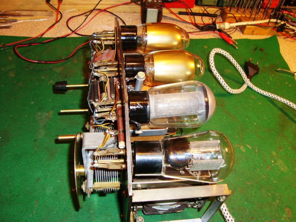 Ki kellett venni a tekercs szerelvényeket, mert meg voltak hajolva a bakelit lapok, meg szakadt volt a visszacsatoló. Megigazítottam a többi tekercset is, majd lelakkoztam őket. Mivel majdnem minden le volt véve a panelről, így egy kis olajos benzinnel lemostam a bakelitot, meg jól áttöröltem, már ahol hozzá lehetett férni. Anti barátom szerkesztett rá egy új skálát is. Ezután módszeresen visszaépítettem mindent, hidegen végigmértem az összes ellenállást 3 db szakadt volt, azt kicseréltem, majd mindent visszahuzaloztam a rajz szerint. Egy régebbi felújított gépből vettem ki csöveket próbára, azzal indítottam be, a végleges csöveket, még le kell gyártani. Szépen szó, jól jön a Kossuth is rajta,bár egy kicsit morgós, gerjedős, hiányzik a fémdoboz. (Tibor barátom már elküldte, ezúton is köszönet érte!) Ha teljesen kész lesz csinálok majd videót is róla, egyenlőre itt vannak a képek.