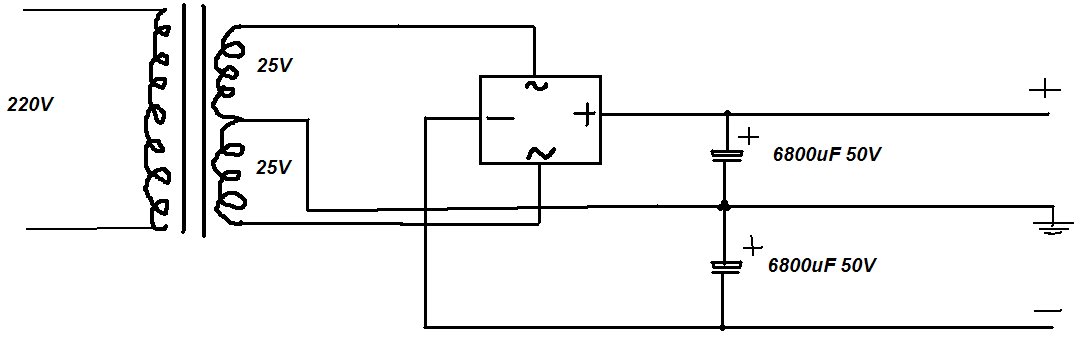 Mérd meg a szekunder feszültséget (25Vac volt üresjáratban) mekkora mikor néma az erősítő és mekkora ha felveszed a hangerőt? Ha ez a változás nagy, akkor túl kicsi a választott szekunder terhelhetősége.