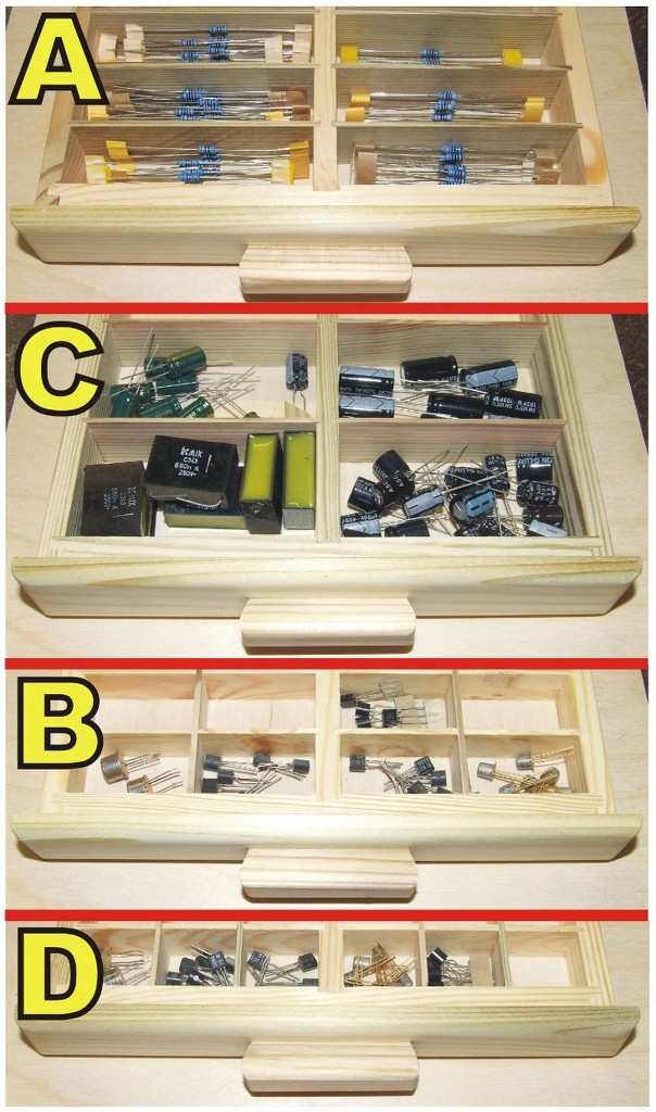 Az 1/2-ed W-os ellenállatok és a nagyobbak, valamint az elkók nálam is hasonló módon vannak rendezve, csak műanyag rekeszes dobozokban. Az elkókat csak feszültség szerint csoportosítottam. Rengeteg bontott alkatrészem van - kimérve! - de ha néha építek valamit, akkor mindig új alkatrészt veszek. Végső sörön a bontott alkatrészeim csak vészhelyzetre vannak, de vészhelyzet nincs
