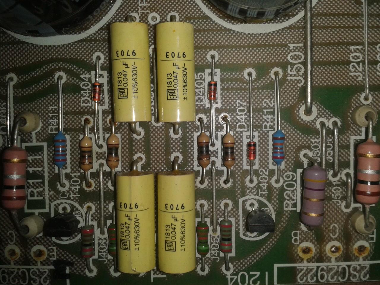 Tehát: a négy égett ellenállás értéke: 7.6Ohm, a színkód alapján 10Ohmnak kellene lenni. Továbbá találtam még 1 égett ellenállást az egyik oldalon, mely gyári értéke: 210Ohm, a mért értéke: 300Ohm (utóbbi ellenállás másik oldali párja 222Ohm)
