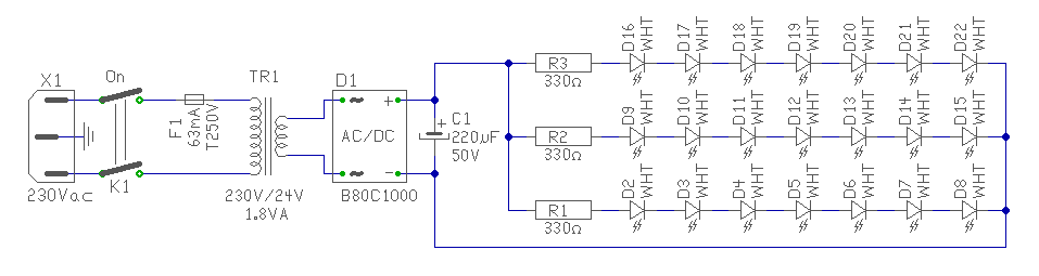 Ha mind két szempontból biztonságot szeretnél, akkor trafó alkalmazása a célszerű. Például ezen az egyszerű módon.. (Igaz, hogy ebben 21 Led van) üdv! proli007