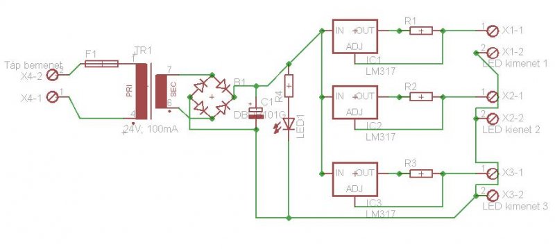 A Led-ek esetében, az áramot kell állandó értéken tartani, nem a feszültséget. Ha megnézed az adatlapot, akkor azon 20mA-t írnak az üzemi áramra, miközben a Led nyitófeszültségét tipikusan 3,6V-ra (maximim 4V-ra a gyártási esetleges szórás miatt) adják meg. - Normál esetben, egy előtét ellenállással a 20mA körüli áramot állítunk be. Az áram, pedig úgy fog változni, ahogy a tápfeszültség változik (jelenleg ez a hálózati feszültség függvénye. - Ha "precizkedni" akarunk, akkor áramgenerátor lenne szükséges, az állandó áram eléréséhez. Ez is megoldható. De akkor minden ág számára, külön-külön áramgenerátor lenne szükséges. (3db esetében még nem katasztrófa) - A feszültséget is szokták stabilizálni. (De semmi képpen nem a diódákra jutó feszültségről van szó, hanem a tápfeszültségről!) Legfőképpen azért, ha a tápfeszültség jelentősen változik, és számtalan párhuzamos ág van. Valamint, ha a Led-ek nyitófeszültségének összege, közel van a tápfeszültséghez. Pld. Ha gépjárműbe tennénk a diódákat, akkor 12V-ra (12V/3,6V=3,3db) így maximum 3db-ot köthetnénk sorba. Így az előtét ellenállásra, 12V-(3*3,6V)=1,2V jutna. Az előtét ellenállás így 1,2V/20mA=60ohm lenne. Ez rendben is van, csak a kocsiban az aksi feszültsége, 12V..14,5V változhat. Így 14,5V esetében az ellenállásra már 14,5V-(3*3,6V)=3,7V jut már. Ez így 3,7V/60ohm=61mA áramot jelentene. Tehát látható, hogy ez itt már nem jó megoldás. Ekkor kell vagy az áramot stabilizálni (számtalan áramgenerátor), vagy a feszültséget stabilizálni, hogy bármekkora bemenő feszültség mellett, az előtét ellenállásra állandó feszültség jusson. (Mert természetesen akkor az áram is állandó értékű lesz.) Tehát sima előtété ellenállás akkor érhető el megfelelő eredmény, ha az ellenállásra eső feszültség "nem túl kicsi", és a tápfeszültség változás "nem túl nagy". Jelen esetben, a hálózati feszültség változását, kb. +-5%-ban kell figyelembe venni. Az ellenállásra jutó feszültség, pedig itt is a nyers tápfeszültség (a pufferkondin) mínusz a sorba kötött Led-ek nyitófeszültségének összege adja. Az eredményt, pedig számítsd ki magad. A névleges áramerősség 20mA, a maximum pedig 35mA (De annyi bizonytalansági tényező van, hogy egy "kistrafó" feszültségesése, a terhelés hatására, inkább csak saccolható, tehát érdemesebb mérni és úgy számolni. (A három párhuzamos ág áramfelvétele, természetesen 60mA) Az előtété ellenállás tényleges értékét, ez alapján lehet kiszámolni. Én csak meghasaltam.. üdv! proli007