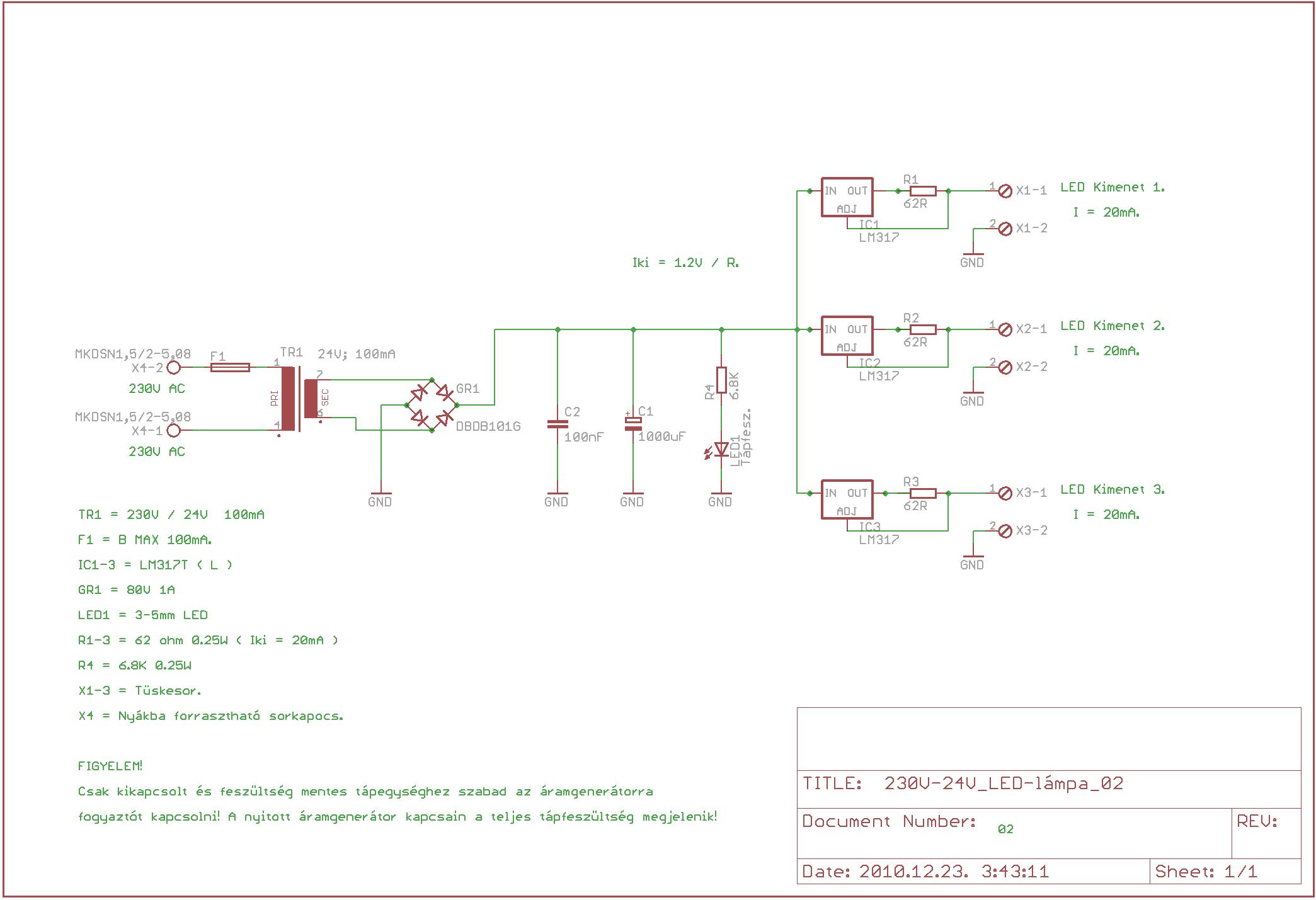 Mivel a Led nyitófeszültsége 20mA esetén 2V, én 10-esével kötném sorba. Ez 20V. és 30db. oszlop. 24V/600mA-es táp kell bele minimum. - Ha a 24V stabilizált, akkor lehet egyszerű előtét ellenállást használni, 4V/20mA=200ohm ez csak 80mW, úgy hogy bármi jó bele. - Ha a 24V változhat, akkor az áramgenerátort jobbnak találom. Igaz ez 30db lenne, de két ellenállás és két 8Ft-os tranyó és két 4Ft-os ellenállás megteszi egy darabhoz. Felület szerelttel még olcsóbb. (Grátiszként még kapcsolható is vele.) üdv! proli007 A hozzászólás módosítva: Márc 1, 2013