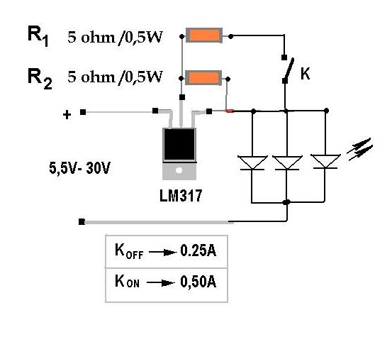 1,25 V/0,5A=2,5Ohm , Tehat 200mA es 500mA kozotti aram beallitashoz 6Ohm es 2,5Ohm vegertrekek kozotti ellenallast lehet hasznalni ket fenyero beallitashoz. Az ellenallas legyen 1W-os adva a maximalis 1,25V*0,5A=0,62W , de lehet ket 0,5W-os 5 Ohm ellenallas parhuzamossan kapcsolva , eggyik allandoan bekapcsolva a masodikat meg egy kapcsoloval beiktatni ha nagyobb fenyero kell.Persze ki kell kiserletezni a ket fenyerore vonatkozo aramerosseget/ellenallaserteket.