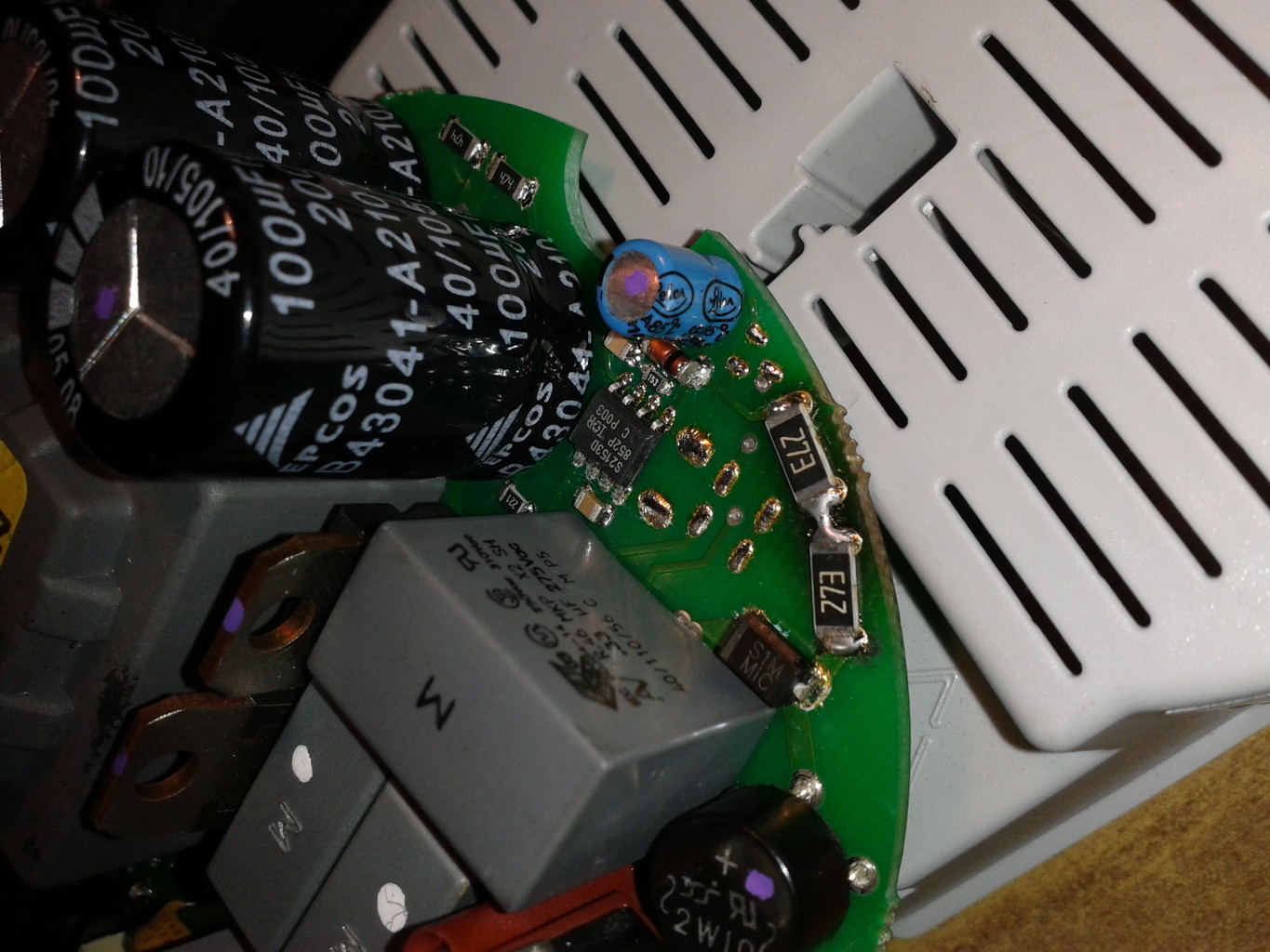 Van egy SMD (minden smd) dióda, föltételezem, hogy az a zener. A 27K-s Vcc elláto ellenállásoknál (smd) egy picit a panel meg van pörkölődve, nem tudom eldönteni, hogy ez normál üzemtől van-e. Közbe írtam, mi a véleményed? Üdv