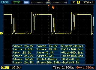 Ha van két csatornád, akkor az egyik csatorna legyen az alsó FET gateje, a másik pedig a a Draine-e (mindkettő a sourcehoz képest). Na egy iylenen rózsásan lehet látni, hogy jó -e, vagy rossz -e a holtidő. Legegyszerűbb megoldás az, ha az IR2153-at lecseréled IR21531-re De lehet még ígyis sok lesz a mágnesező áram, és a félhíd kapacitása gyorsan áttöltődik. Ekkor egy kis plusz félhíd kapacitást lehet berakni.