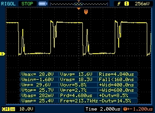 A lényeg, hogy a négyszögjel fel/le futása ne legyen meredek, hanem kb. annyi ideig tartson mint a meghajtó holtideje. Nem a legszebb, de valami ilyesmi. Ha olyasmit látsz, hogy egy darabig ilyen lassú az emelkedés, majd hirtelen merdekké válik, akkor "belekapcsolt" a fet az átmenetbe. Azonban ennek akkor van értelme nekiállni, ha egyébként ZCS-ben jól megy a táp. A belinkelt hullámformáid "hihetőek" amikor lecsökken a félhíd áramam, a magára haygott rezgőkörök (+ parazita induktivitások és kapacitások) rezegnek, amig valamelyik fet ujra ki nem nyit. Játszani kell a primer induktivitással (picike légrés a trafóba), és a ZVS kondival, és közben persze mérni. Ha kitartó vagy, akkor rá fogsz érezni a dolgok menetére.