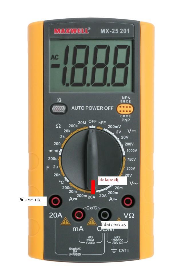 A piros merozsinor egyik veget tedd a tap pozitivpontjara, a masikat a muszer nagyaramu csatlakozojaba dugd. [melle van irva, hogy 10A v. 20A] Kapcsold a muszert a nagyaramu meresre.