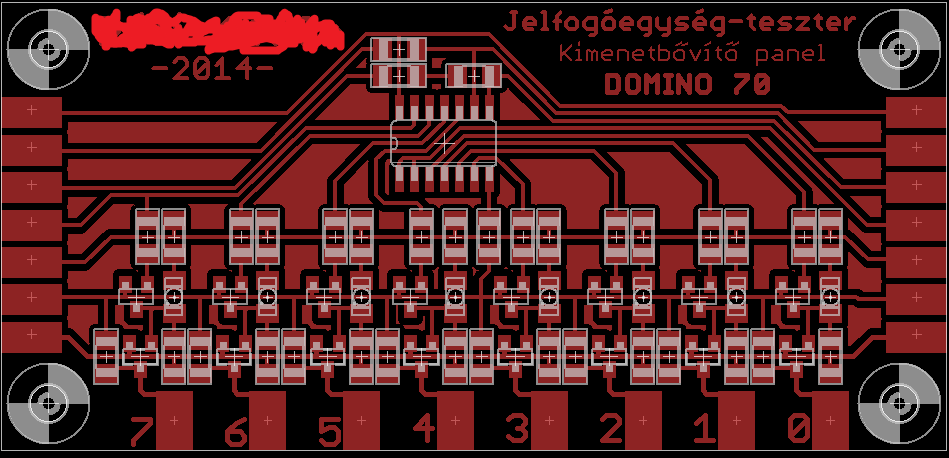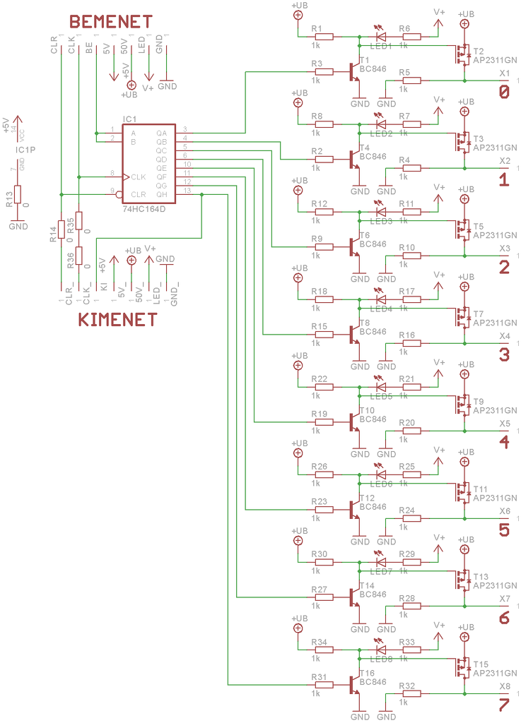 A kimenetekkel már nem kell foglalkozni, azokat 74HC164-e(kke)l oldottam meg, ez csupán kb 30Ft. Ez mindössze 4db lábát foglalja le a PIC-nek és gyakorlatilag végtelen kimenetem lehet. Terveztem hozzá egy olyan nyákot aminek a két rövidebbik oldalain forrpontok vannak és ezeken egyszerűen össze lehet fűzni akármennyi ilyen nyákot, panelonként 8db kimenettel bővül így az áramkör. A "+UB" nevezető pontokra jön az 50V (vagy ha latch-elni akarok akkor 0V), a "V+"-ra pedig szintén az 50V jön, ez csak azért van hogy az áramkör tesztelésekor a LED-ekkel láthassam hogy melyik kimenet aktív és melyik nem. Azért vezettem ki külön hogy a latch-eléstől függetlenül is működjenek a LED-ek. Ez a 74HC164-es megoldás azért is nagyon tetszik mert nektek csak 50db ki/bemenetet mondtam de az az igazság hogy egyenlőre nem tudom mennyi kell. Valószínűleg tényleg kb 50db, de matematikailag elméletben akár 288db kimenet is kellhet. Ebből a kis panelből pedig amit most mutatok, bármennyi felfűzhető egymás után! ![]() foxi63! Olyannyira spórolni kell hogy itt az optocsatoló óriási luxus! Ha megnézed ezt a nyákot, még a csatlakozókat is lespóroltam, csak forrpontok vannak a nyák szélein.