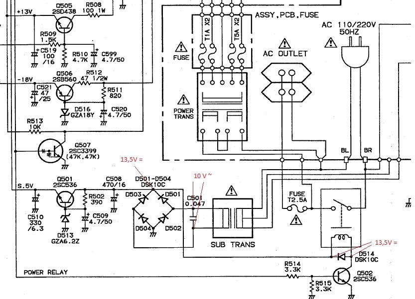 A SUB TRANS egy állandó üzemű transzformátora a készüléknek. A leírtak szerint helyesen is működik. A 701-es pozíciószámú vezérlő IC PWR RLY lábán +5V-nak kell megjelenni, ha a távirányítóval, vagy az erősítő gombjával bekapcsolod az erősítőt. Ez jut el az R514-re. Mérd is meg ezen ellenállás lábain a feszültséget testhez képest! Amennyiben Q502 bázisára +0,7V, vagy annál nagyobb feszültség jut, akkor ezen tranzisztor, vagy a relé hibás, ha az nem húz meg.