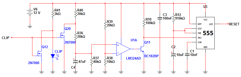 A képen látható az ötlet. Leírnám, hogy mi lett volna a terv: A lényege az lenne, hogy a CLIP (active-low) IC kimenetre csatlakozik 2 FET, a Q12 csak a CLIP LED-et hajtja meg (így a kívánt visszajelzés adott). A Q20 - ha nincs CLIP - az R40 ellenállást földeli, így nem tudja a kondit tölteni. Majd CLIP esetén megszűnik ez a blokkolás, és a C4 R40+R36-on keresztül töltődik. Az R37 lassan kisüti (ez a lyuk a poháron ) Innentől fogva a komparátor átbillen, ahogy a kivánt töltöttséget (a referencia feszt) eléri a kondi. Az LM kimenete megküldi a Q11 tranyót, ami megbolygatja az addig nyugodt timert, és az a jelen példa szerint kb. 10 sec-ig magasan tartja a kimenetét, ami már használható RESET indításra is. (Ez a 10 sec adásszünet már kellően bosszantó ahhoz, hogy érdemes legyen halkítani, feltéve ha tudja az illető, hogy mi a gond)Összességében ez így működik a szimuláción, csak az alkatrészek értékein kellene finomítani. Az R40 + R36 és a R37 befolyásolja, hogy "mennyire nyitom meg a csapot", Ezekkel az értékekkel a progi szerint kb 1 sec folyamatosan aktív CLIP kell ahoz, hogy a komparátor átbillenjen... Szerinted így jó lehet?