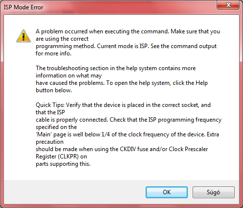 Üdv, remélem jó helyre teszem fel a kérdésem, AVR-Doper programozót nemrégiben építettem meg (Hesote-os kittben). Most vágnék bele a programozásba, az ATtiny45-ös cikkben lévő 2 ledes villogót próbálnám megcsinálni, de a következő problémám van AVR Studio 4-ben a read signature gombra kattintva felugrik egy ISP mode error ablak, rákerestem a neten, de sajnos nem nagyon hozott eredményt egy megoldás sem amit találtam.